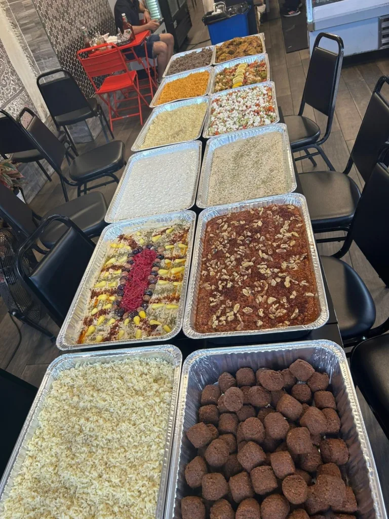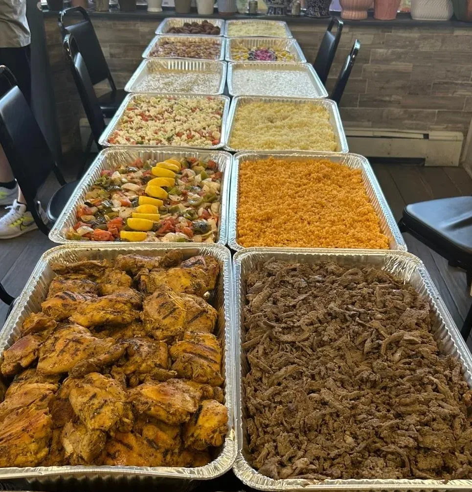 4 lbs meat, 4 lbs salad, 2 lbs hummus or tzatziki, 2 lbs baklava, 10 pita.Choice of meat: chicken shish, lamb shish, falafel, kofte, beef-lamb adana, chicken adana, beef-lamb gyro, chicken gyro.
